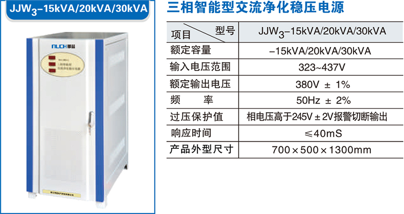 JJW系列智能型交流净化稳压电源是一种高性能新型电子式交流稳压电源设备,是目前国际上流行的性能比较优越的交流稳压电源品种之一,被广泛应用于高精尖电器设备和常规用电设备的供电稳压。