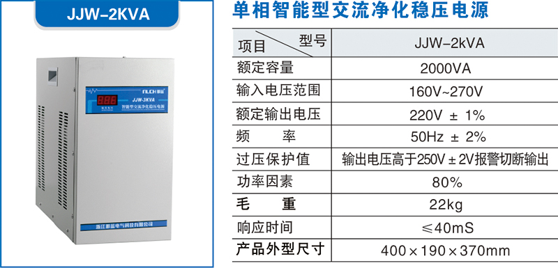 JJW系列智能型交流净化稳压电源是一种高性能新型电子式交流稳压电源设备,是目前国际上流行的性能比较优越的交流稳压电源品种之一,被广泛应用于高精尖电器设备和常规用电设备的供电稳压。